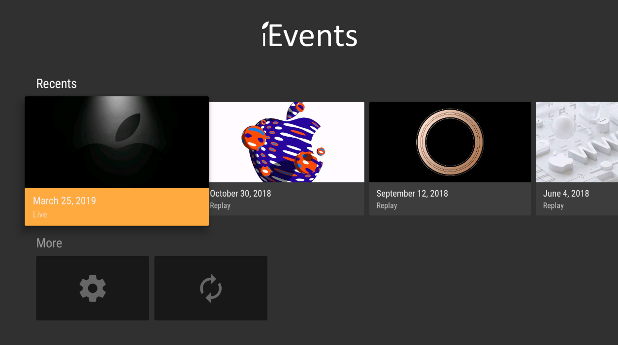iEvents is an unofficial Apple Events app for Android TV.iEvents makes it easy to watch Apple's latest and upcoming keynotes on-demand and live directly from your Android TV setup.